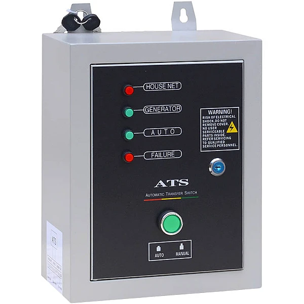 На передней панели блока расположены контрольные лампы, которые оповещают пользователя о текущем состоянии электросети, режиме работы генератора и неисправностях. Кроме того, отдельный индикатор позволяет быстро определить, как режим АВР активен - ручной или автоматический.
