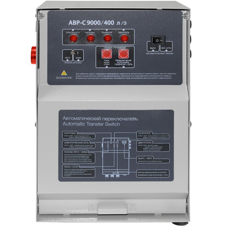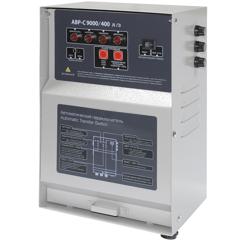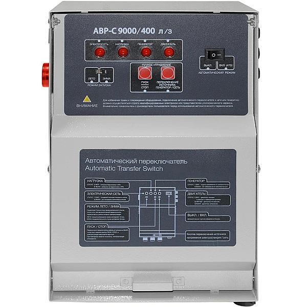 Блок АВР для бензинового генератора 6-8 кВт/400 включает в себя систему автозапуска (автоматического ввода резервного электропитания). При появлении основного источника электропитания происходит отключение электростанции. Блок автоматического управления для контроля наличия напряжения в сети.