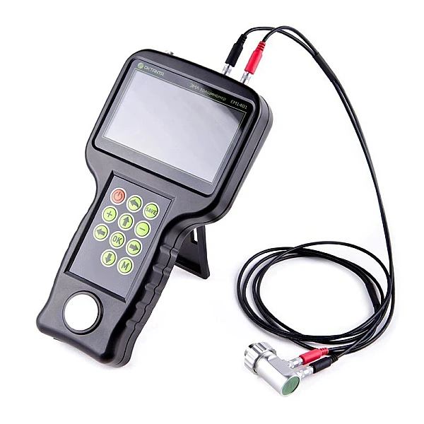 Толщиномер EM1401 UT имеет возможность подключения высокотемпературного датчика EMT14014T, который позволяет измерять толщину горячих объектов, нагретых до 750 градусов по Цельсию. В приборе реализован специальный алгоритм, учитывающий изменение скорости распространения звука в металле от температуры.