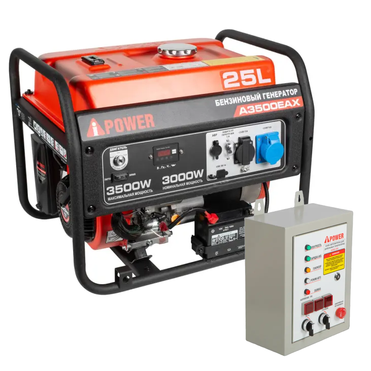 Бензиновый генератор A-iPower A3500EAX + блок автозапуска A-iPower 400 В, 25 А - надежный источник питания мощностью 3 кВт. Главные преимущества модели - до 14 часов работы на одном баке топлива и возможность подключения приборов с пусковой мощностью до 7 кВA, например, высоко производительного ручного инструмента с электродвигателем.