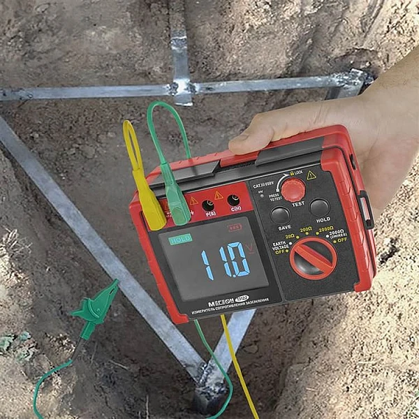 Цифровой прибор МЕГЕОН 13122 используется для определения сопротивления заземления по 2-проводной или 3-проводной схеме. Для дополнительной безопасности изделие оснащено измерителем напряжения земли (шаговое напряжение). Применяется специалистами для диагностики, технического обслуживания и ремонта различных заземляющих систем, электроустановок, распределительных устройств и УЗИП, а также другого электрического оборудования. Диапазоны измерений выбираются вручную. Предусмотрено удержание текущих показаний на дисплее. Модель имеет встроенное хранилище на 20 результатов.