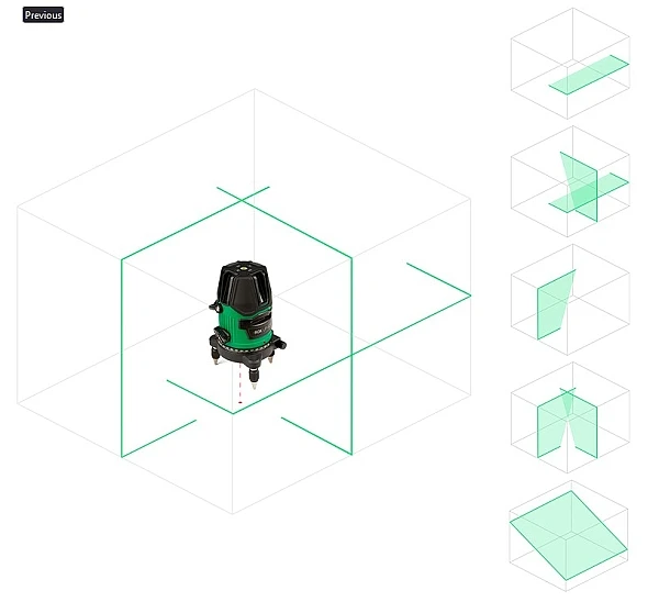 Прибор проецирует линии, которые образуют перед ним лазерный крест. Устройство лазерного уровня RGK LP-62G позволяет включать горизонтальную, вертикальную или обе одновременно проецируемые линии. Данная функция помогает сохранить заряд аккумулятора.