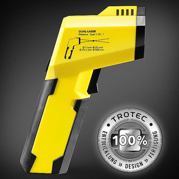 С помощью пирометра BP25 вы можете измерять температуру поверхности стен, материалов и объектов без необходимости контакта. Для более точной оценки местоположения и размеров пятна измерения BP25 оснащен двойным лазерным целеуказателем. Он проецирует две лазерные точки, указывающие диаметр пятна измерения на измеряемой поверхности. Инфракрасный датчик измеряет значение температуры в этой области, затем определяется среднее значение. Чем меньше пятно измерения, тем точнее результат и чем больше расстояние между измерительным прибором и объектом измерения, тем больше диаметр пятна измерения. Благодаря своему оптическому разрешению 20:1 прибор дает точные измерения даже с расстояния в несколько метров.