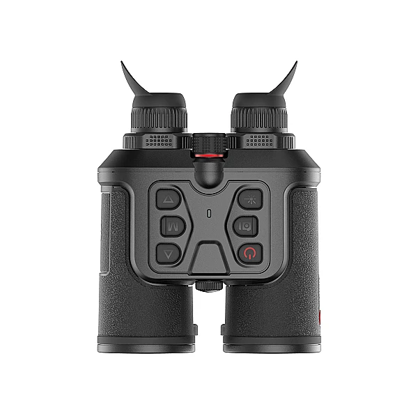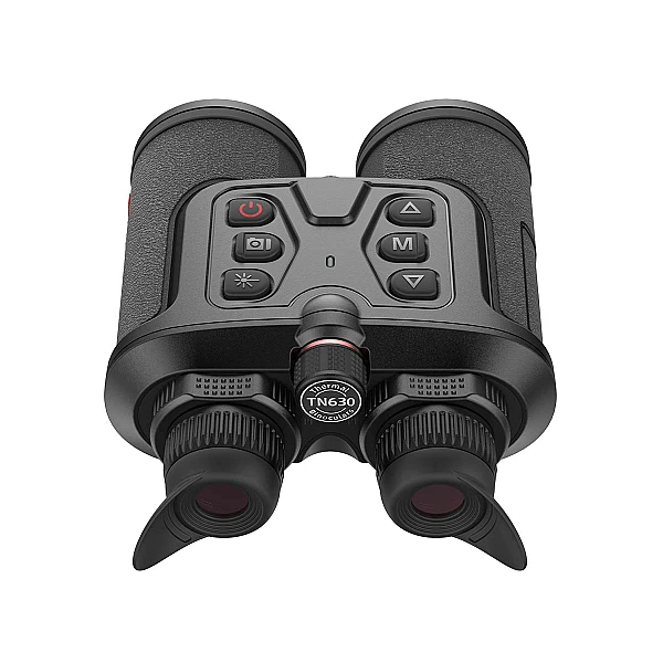 Визуально тепловизионный бинокль TN630 выглядит несколько необычно – внешне он напоминает бинокль, внутри это конструкция с одним объективом и двумя цифровыми экранами для комфортного наблюдения. Изображение с объектива обрабатывается и передаётся на оба экрана, что позволяет комфортно выслеживать цель на охоте, не утомляя глаза. Тепловизионный бинокуляр разработан на базе неохлаждаемого ик-детектора VOx, и полноцветным OLED-дисплеем с высоким разрешением 1024×768 пикселей. Плотность пикселей у TN630 составляет 12μm, инженеры Guide позаботились об идеальном качестве изображения. Частота обновления изображения составляет 50 Герц. Быстрая и точная обработка кадров - чёткая картинка без задержек и шлейфов, не дёргается как у тепловизоров с 9Гц. Кнопки управления расположены сверху и немного выступают над корпусом для облегчения доступа в темноте.